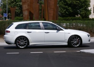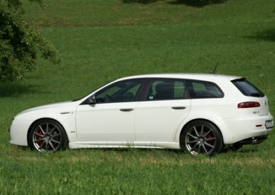 Die Leute wissen: Alfa Romeo baut sportliche Limousinen. Aber viele wissen nicht, dass die Italiener auch einen Kombi im Programm führen. Zeit, ihn vorzustellen, den 159 SW. SW steht für Sport Wagon, also doch eher sportlich als Nutzwert? Im sportlichen Weiss steht der Alfa vor mir. Er blinzelt mir mit seinen sechs Augen zu. Das ist noch bestens bekannt, denn dieser 159 wird einer der letzten sein, bis er im Jahr 2012 durch den neuen Giulia abgelöst wird. Mit der geringen Höhe von 1422 mm sitzt er geduckt sportlich auf der Strasse und sieht schon im Stand schnell aus.