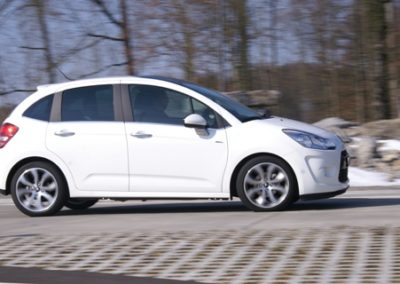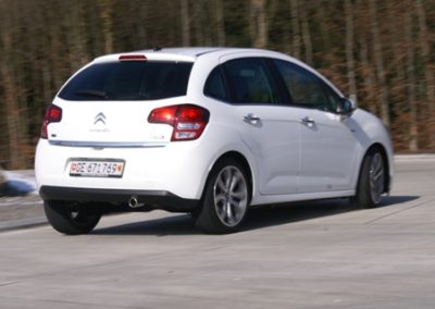 Nun aber fahren. Der C3 kommt gut vom Fleck, ohne überschäumende Kraft zu offenbaren. Das ist optimal, um im täglich Verkehr locker mit zu fahren. Für das Kurvenräubern zeigt sich der Citroën nicht geschaffen, obwohl sein Motor mithalten könnte. Die Lenkung wirkt etwas synthetisch, und die Federn sind zu sehr auf Komfort ausgerichtet. Der C3 fühlt sich in der Stadt eh wohler als auf kurvenreichen Strecken, und wer einmal in der Nacht an der Ampel steht, kann durch sein Panoramadach die Sterne betrachten. Das beindruckt die Frauen.