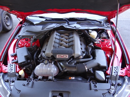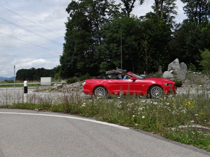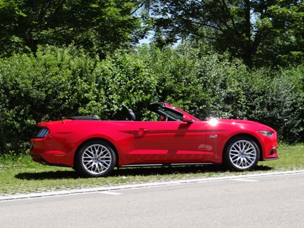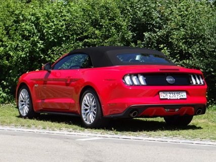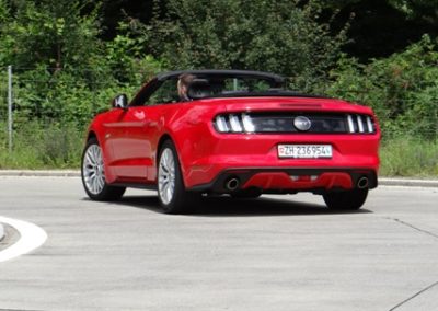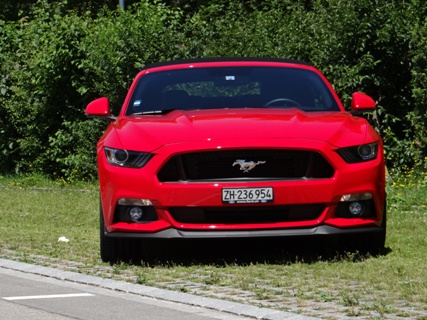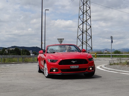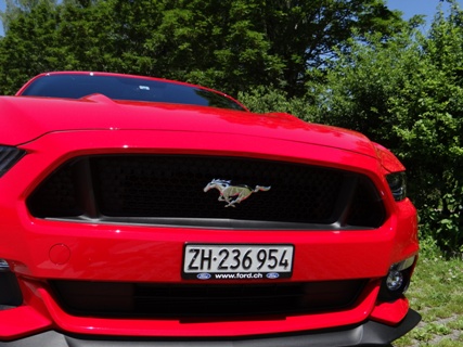 Wie ein Kind freue ich mich den Mustang ab zu holen. Als ich den Schlüssel in der Hand hielt konnte ich es erst gar nicht glauben. Es herrscht ein unglaublicher Mythos über den US-Ford. Erst einmal ein paar Runden um den Traumwagen von etlichen Menschen drehen. Einfach ein Traum die bullige Nase, die lange Haube, dicken Schlappen und die Heckansicht mit ihren abgesetzten Leuchten. Die Auspuff-Anlage zeigt im Stand schon die Potenz der 5-Liter-V8-Maschine. Jetzt aber reinsetzen, im Innenraum kommt man sehr schnell zurecht, denn sehr viel kommt von den anderen Ford-Modelle. Inklusive das Touchscreen, das nicht immer sauber auf die Berührungen reagiert und daher viel vom Verkehr ablenkt. Ansonsten kommt man sehr schnell klar mit der Bedienung der Klimaautomatik inklusive Sitz-Heizung-/Lüftung. Im Cockpit wurden ein paar Hartplastik-Teile verwendet, jedoch wirkt der Neue edler als der Vorgänger. Der Startknopf wartet und will gedrückt werden. Dem komme ich nach und der V8 meldet sich mit einem kurzen Gasstoss zum Dienst. Die Auspuffanlage versprach zwar mehr, aber auch dies erzeugt schon Gänsehaut. Wer mehr Sound will, einfach zum nächsten Tuner gehen. Nun langsam das Pony aus dem Parkfeld bugsieren. Gar nicht so einfach mit seiner harten Kupplung und seinen grossen Aussenabmessung. Auf der ersten Geraden will ich mal die Potenz des Motors testen und trete das Gas durch. Der Drang nach vorne ist unglaublich gepaart mit diesem Sound zaubert es ein Lächeln ins Gesicht. Trotz einem Leergewicht von knapp 1.8 Tonnen wuselt der Mustang schnell durch Kurven.