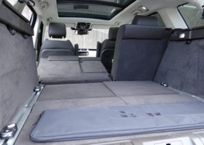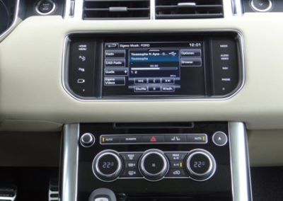 Auf die Vorderplätze muss man ganz unsportlich hinaufklettern. Es sei denn die Luftfederung senkt die Karosserie nach ganz unten. Dann zeigt sich der Zustieg ganz bequem. Das Cockpit ist identisch mit dem des grossen Range. Die Instrumente für Geschwindigkeit und Drehzahl werden digital dargestellt im grossen Display hinter dem Lenkrad. Was natürlich nicht fehlen sollte im Range Rover Sport: Die gute Verarbeitung und auserwählte Materialien. Kunststoff findet man ganz selten. Der Navi-Bildschirm ist gross und lässt sich per Touchscreen bedienen. Leider auch die zusätzlichen Direkttasten, die während der Fahrt nicht immer Rückmeldung liefern, ob sie gedrückt wurden und somit vom Verkehr ablenken. Auch die Menüstruktur muss erst einmal einstudiert werden. Der Blick weiter nach unten auf der Mittelkonsole geht zum Automatik-Wählhebel beziehungsweise Joystick, wo die Fahrstufen elektronisch angetippt werden. Das heisst: Der Hebel fällt immer wieder in die Mittelstellung.