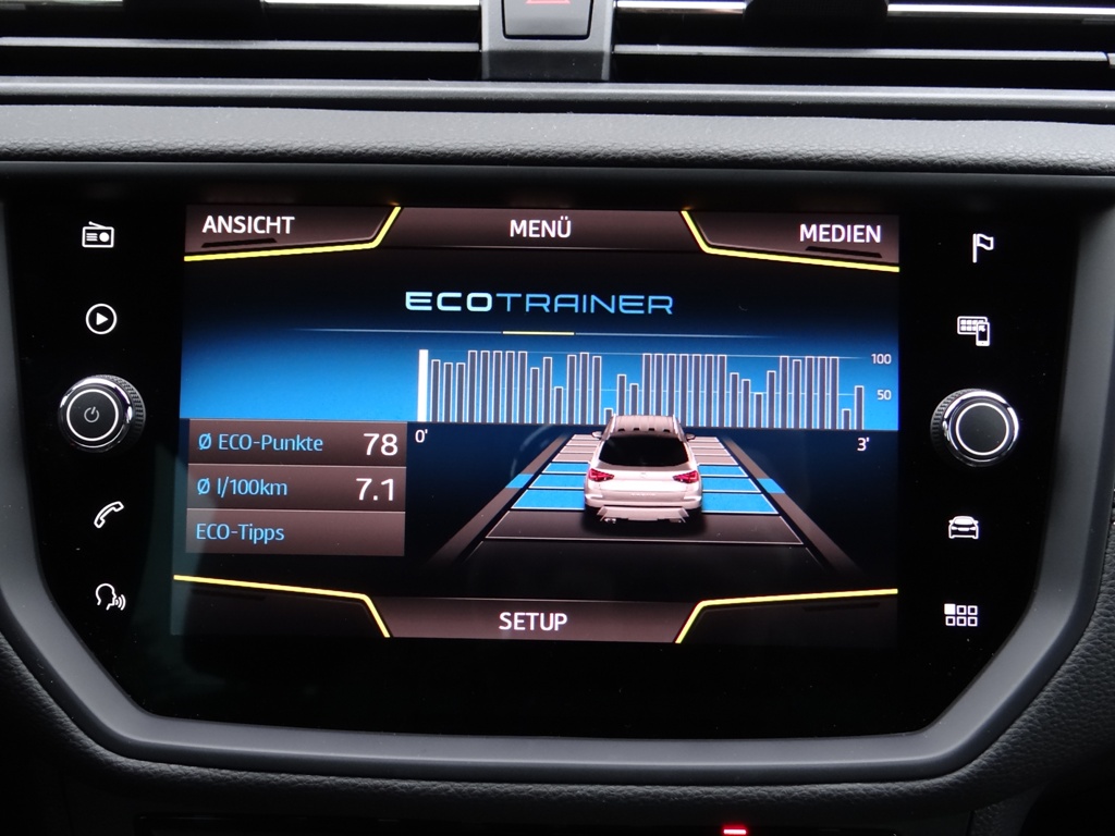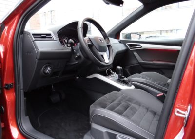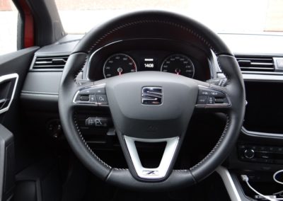 Die angenehme Sitzhöhe stimmt schon mal. Was aber vermisst wird, ist eine Gurt-Höhen-Verstellung. Man blickt auf ein ansprechliches Armaturenbrett. Ganz sportlich fangen die Uhren für Geschwindigkeit und Drehzahl unten an zu zählen. Für die Geschwindigkeit muss man, durch seien Aufteilung, immer einen Blick haben, dass man nicht zu schnell unterwegs ist. Einfacher lässt sich im Arona das Infotainment-Display ablesen. Der Touchscreen nimmt gut den Befehl des Fingers entgegen. Zum Glück gibt es noch zwei klassische Drehknöpfe. Natürlich versteht sich das System auch mit den Smartphones und zeigt deren Inhalt an. Für vier Personen bietet der Spanier genug Platz für eine Reise und im Kofferraum kann Gepäck mit von 400 Litern.