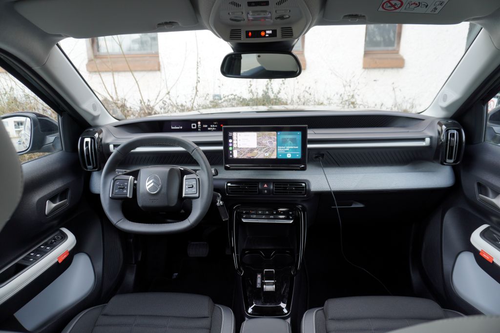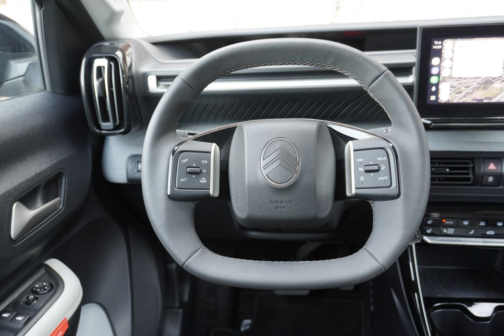 Dank der Plattform, die der Franzose mit Opel Frontera und Fiat Grande Panda teilt, kann der C3 den Preis nach unten drücken. Die Seitenansicht zeigt schon seine Verwandtschaft, aber durch clevere Anbauteile vorne und hinten erkennt man es nicht sofort. Somit steigen wir in den Franzosen ein und nehmen auf kuscheligen Sitzen Platz. Fast wie zu Hause auf dem Sofa. Hier blieb Citroën sich selbst treu. Das eckige Lenkrad ist dann schon eher gewöhnungsbedürftig, mehr Freude bringen die Tasten darauf, die man blind bedienen kann. Im Blick nach vorne zeigt ein digitales Display die nötigen Infos ohne grossartigen Verstellmöglichkeiten. Das Infotainment nimmt es mit den Smartphones auf und kann das Navi sogar kabellos per CarPlay und AndroidAuto anzeigen. Somit kann man sich die Option mit dem Navi sparen. Die Klimasteuerung klappt sehr gut mit Tasten, die man blind findet. Den Knöpfen merkt man dann aber den Sparzwang an und dies geht auch auf die Armaturenbrett über. Es wurde überall Hartplastik verbaut, aber es wurde gut verarbeitet, denn man findet keine Grate. Citroën kaschiert die Öde mit etwas Stoff und mit Etiketten verteilt im C3, die ein Lächeln ins Gesicht zaubern. Zu viert reist man angenehm und wenn mal mehr mit muss, ist durch umlegen der Rücksitze einen ebenen Raum mit einer Fülle von 1600 Liter vorhanden.