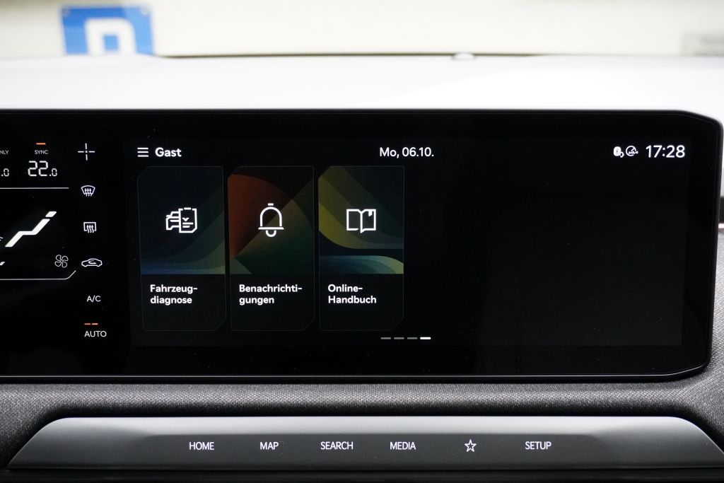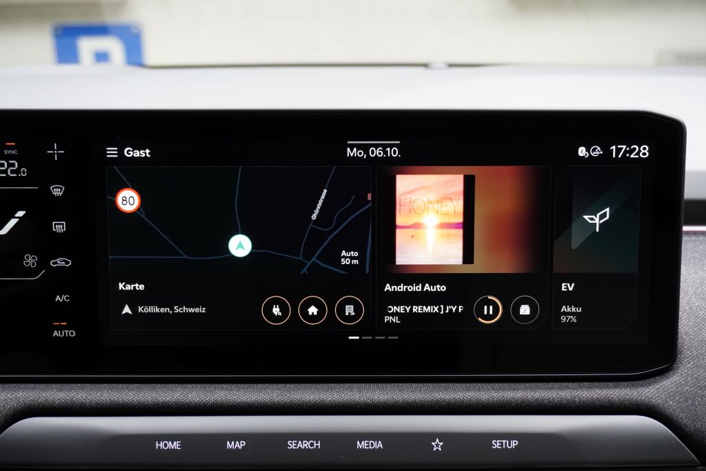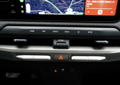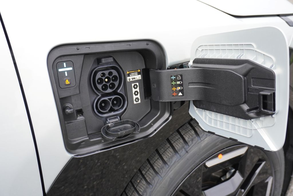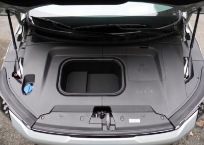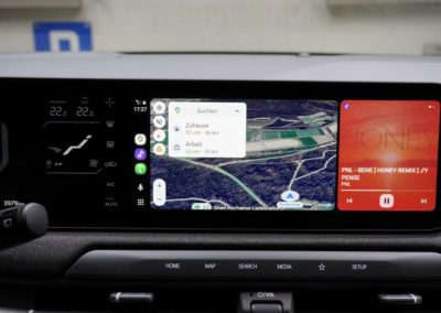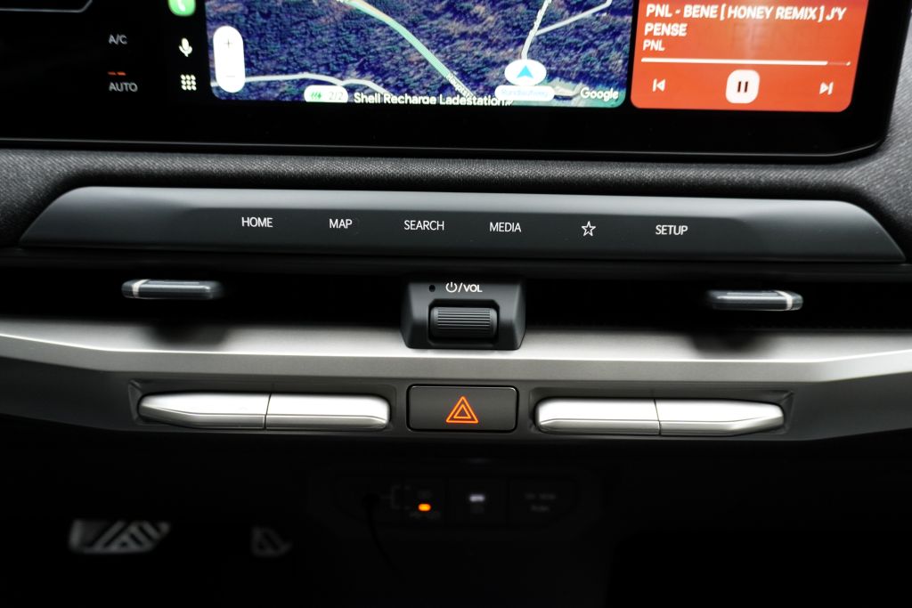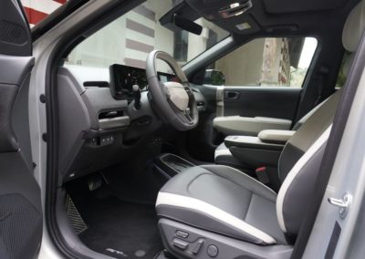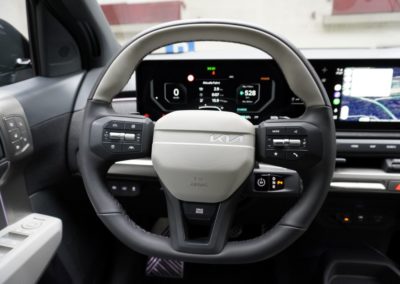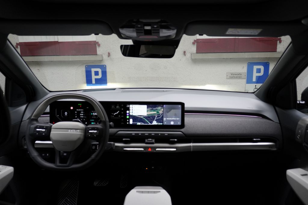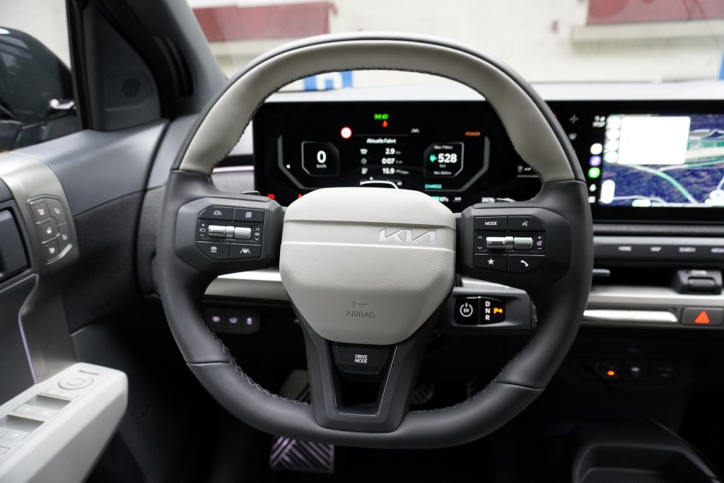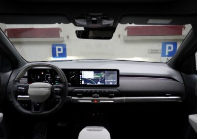 Ob jetzt eine 800 oder 400 Volt-Technik unter dem Blechkleid steckt spielt an der Wallbox zu Hause noch nicht eine Rolle. Der EV3 lädt hier auch innerhalb von acht Stunden seinen Akku voll. Interessanter wird es am Schnelllader, hier kann der Kompakt-SUV logischerweise nicht so schnell laden wie seine grösseren Geschwister. Doch er schafft von 10 auf 80 % in guten 32 Minuten. Schön gelöst die Klappe am EV3 für den Schnelllader. Andere Hersteller haben nur eine Kappe, die dann unschön herunterhängt. Nun schauen wir uns Innen um, da wir ja eh warten müssen. Die Sitze sehen gut und bequem aus. Wir setzen uns und stellen fest, es ist auch so. Man schaut auf ein helles Lenkrad und wir sind schon mal glücklich über echte Tasten. Vor dem Volant thront ein Display, das sich nach rechts zieht bis zum Infotainment. Hier vermissen wir dann schon echte Tasten, denn auch die Klimaautomatik wird über den Touchscreen bedient. Das Infotainment ist auf der Höhe der Zeit. Es kann das Smartphone auch kabellos spiegeln per CarPlay und AndroidAuto. Zu viert reist man sehr gut im Kia und bringt noch Gepäck unter von 460 Liter. Unter der Motorhaube gibt es auch noch Stauraum, leider ist der zu klein um das Ladekabel unter zu bringen und muss somit hinten untergebracht werden.