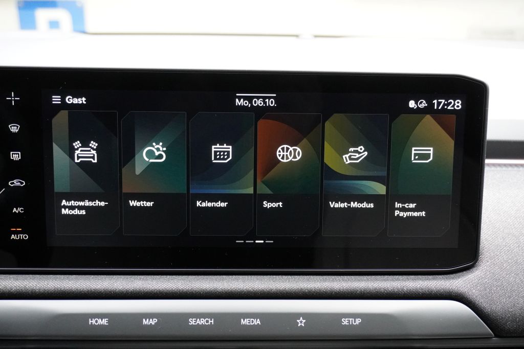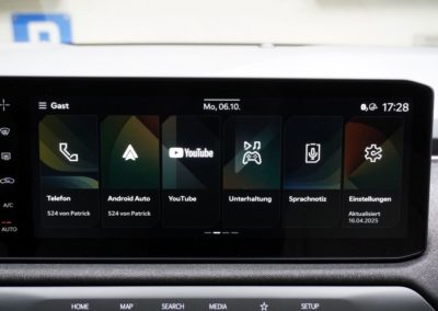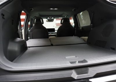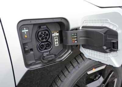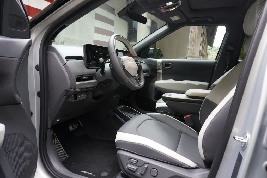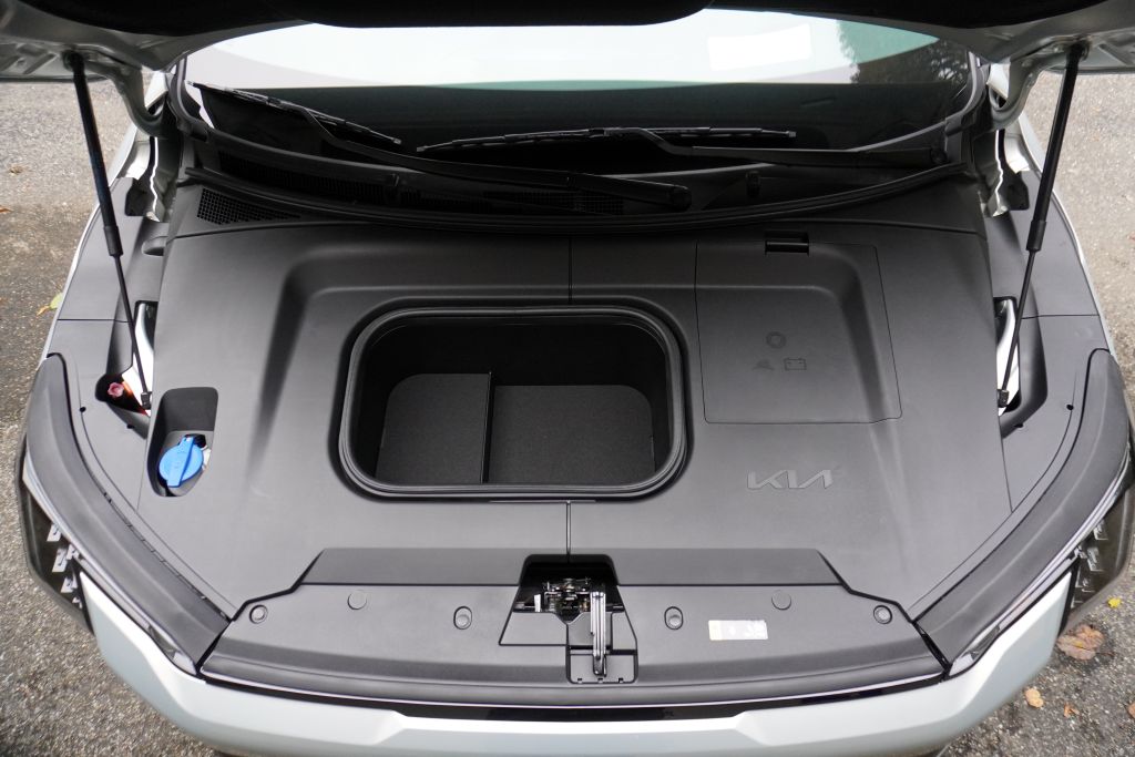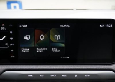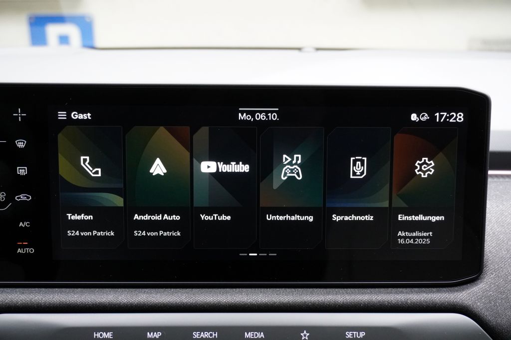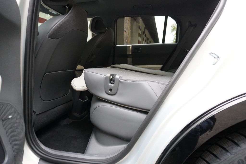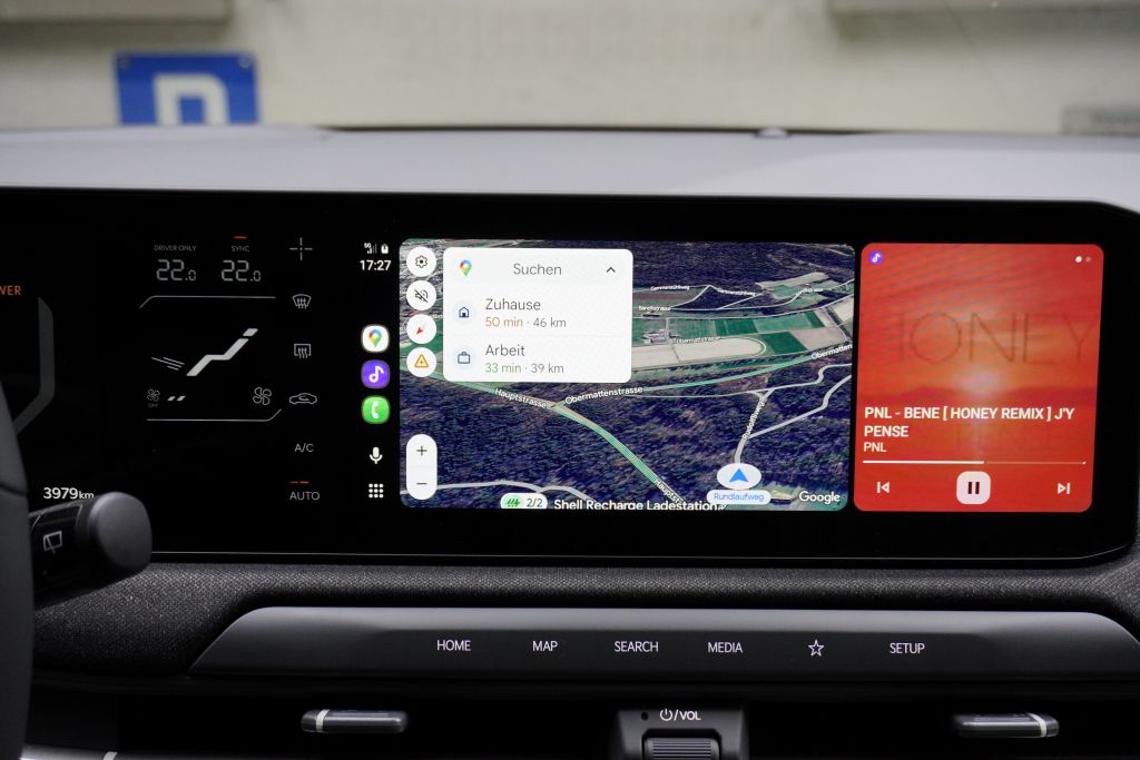 Ob jetzt eine 800 oder 400 Volt-Technik unter dem Blechkleid steckt spielt an der Wallbox zu Hause noch nicht eine Rolle. Der EV3 lädt hier auch innerhalb von acht Stunden seinen Akku voll. Interessanter wird es am Schnelllader, hier kann der Kompakt-SUV logischerweise nicht so schnell laden wie seine grösseren Geschwister. Doch er schafft von 10 auf 80 % in guten 32 Minuten. Schön gelöst die Klappe am EV3 für den Schnelllader. Andere Hersteller haben nur eine Kappe, die dann unschön herunterhängt. Nun schauen wir uns Innen um, da wir ja eh warten müssen. Die Sitze sehen gut und bequem aus. Wir setzen uns und stellen fest, es ist auch so. Man schaut auf ein helles Lenkrad und wir sind schon mal glücklich über echte Tasten. Vor dem Volant thront ein Display, das sich nach rechts zieht bis zum Infotainment. Hier vermissen wir dann schon echte Tasten, denn auch die Klimaautomatik wird über den Touchscreen bedient. Das Infotainment ist auf der Höhe der Zeit. Es kann das Smartphone auch kabellos spiegeln per CarPlay und AndroidAuto. Zu viert reist man sehr gut im Kia und bringt noch Gepäck unter von 460 Liter. Unter der Motorhaube gibt es auch noch Stauraum, leider ist der zu klein um das Ladekabel unter zu bringen und muss somit hinten untergebracht werden.