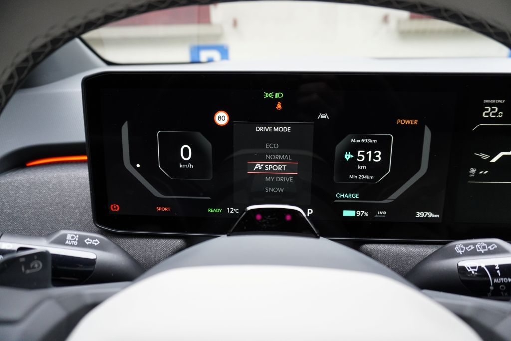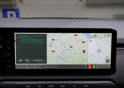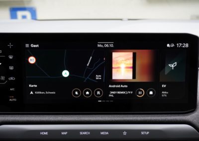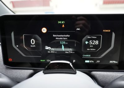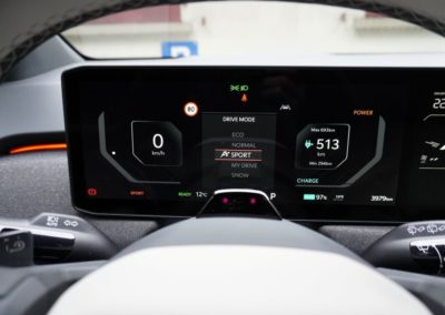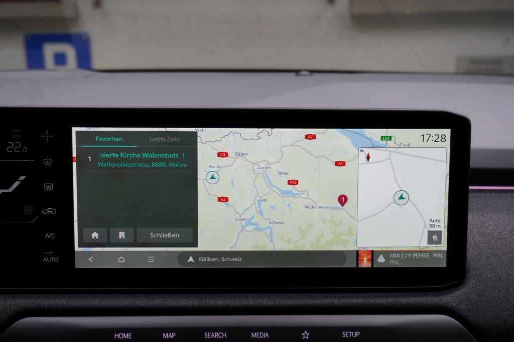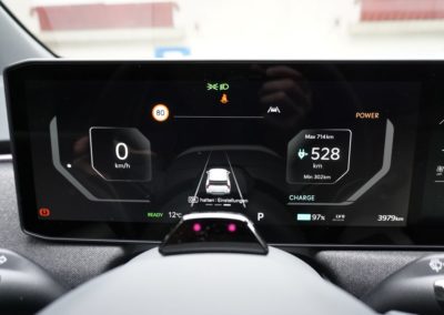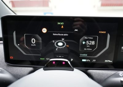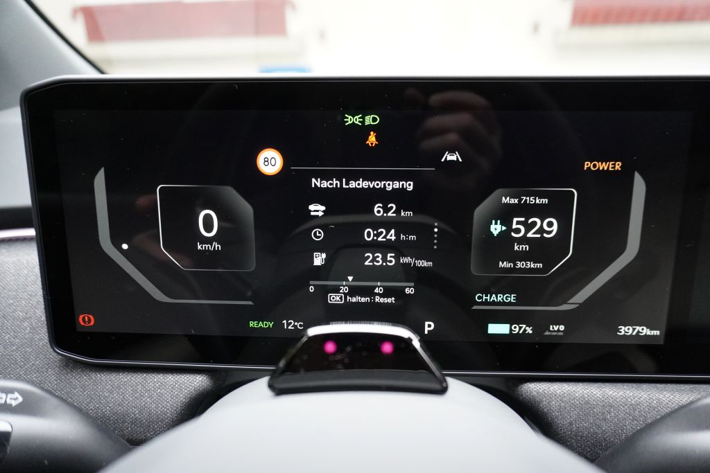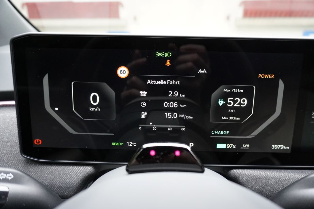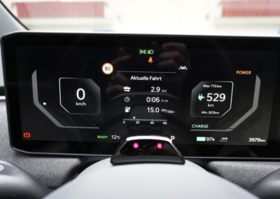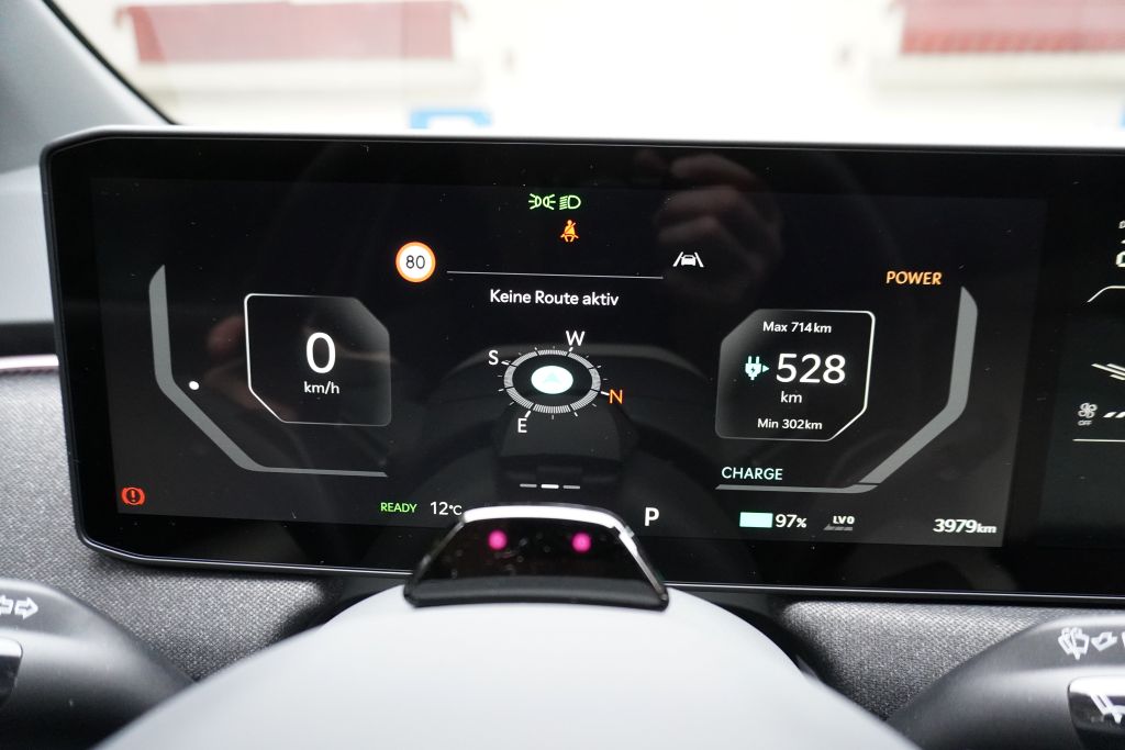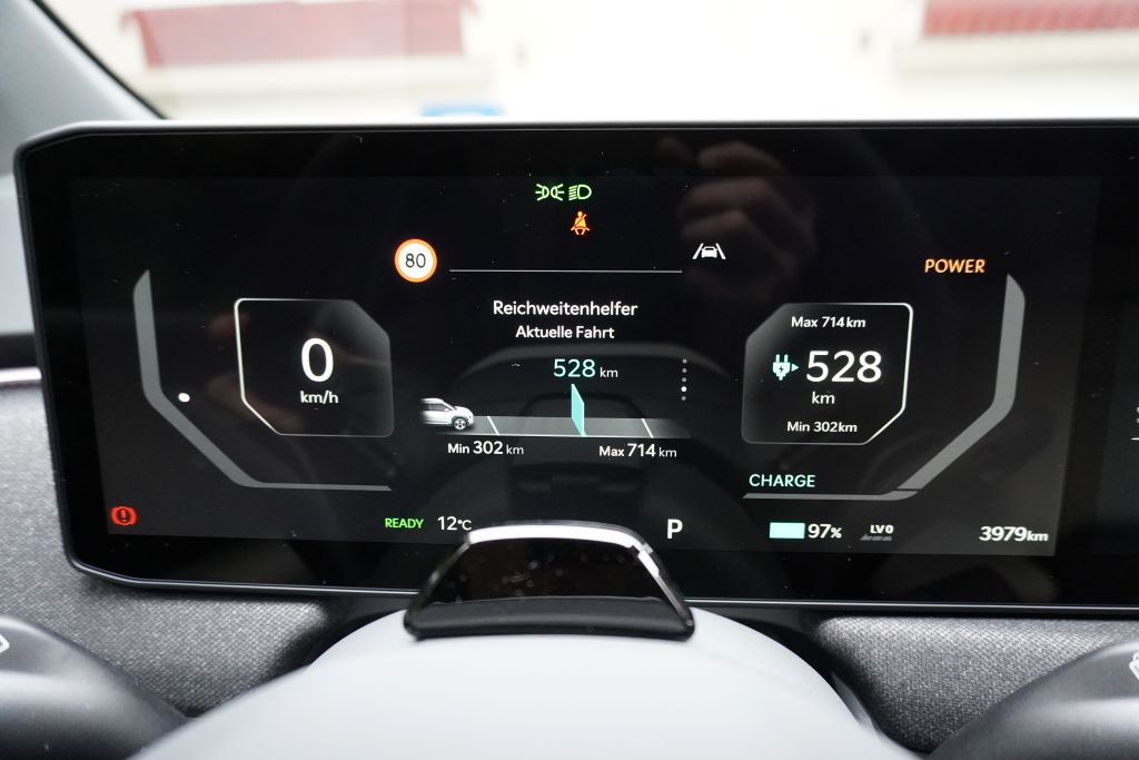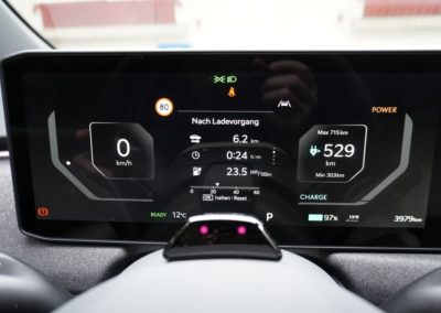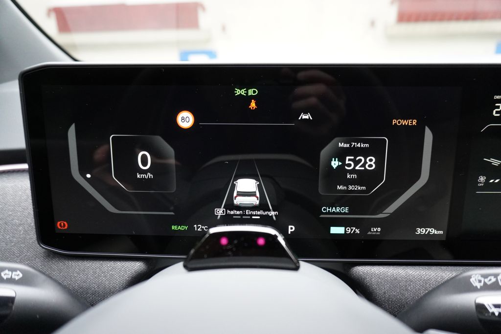 Nun aber auf die Piste. Die Anzeige verspricht uns 530 km und dies wollen wir sehen. Der Kia zieht ordentlich vorwärts und bewegt sich hier im Mittelfeld mit der Konkurrenz. Etwas straff fährt der Koreaner über Verwerfungen in der Strasse. Sportlich bewegt der EV3 sich um Kurven und das ESP hält den SUV gut in der Spur ohne dass der Fahrer viel davon mitbekommt. Ein ganzes Arsenal begleitet der Kia den Fahrer auf längeren Strecken. Er fährt aktiv in der Spur, überwacht den toten Winkel und hält den Abstand zum Vordermann. Der ist zwar auch bei der kleinsten Einstellung zu gross, dass immer wieder Autos vorne einscheren und der Koreaner abbremsen muss. Doch erledigt er dies immer sicher ohne eingreifen des Piloten. Wie es heute zur Pflicht gehört liesst der Koreaner auch die Temposchilder und speist sie ins Display ein. Doch dies ist nicht immer korrekt. Gut hingegen die Rund-um-Kameras, die sogar im Rückspiegel verbaut sind und helfen beim rangieren bequem den Randstein zu sehen. Nun aber wieder zurück von unseren Runde. Der Kia EV3 schaffte bei uns stolze 480 km Reichweite. Ein guter Wert!