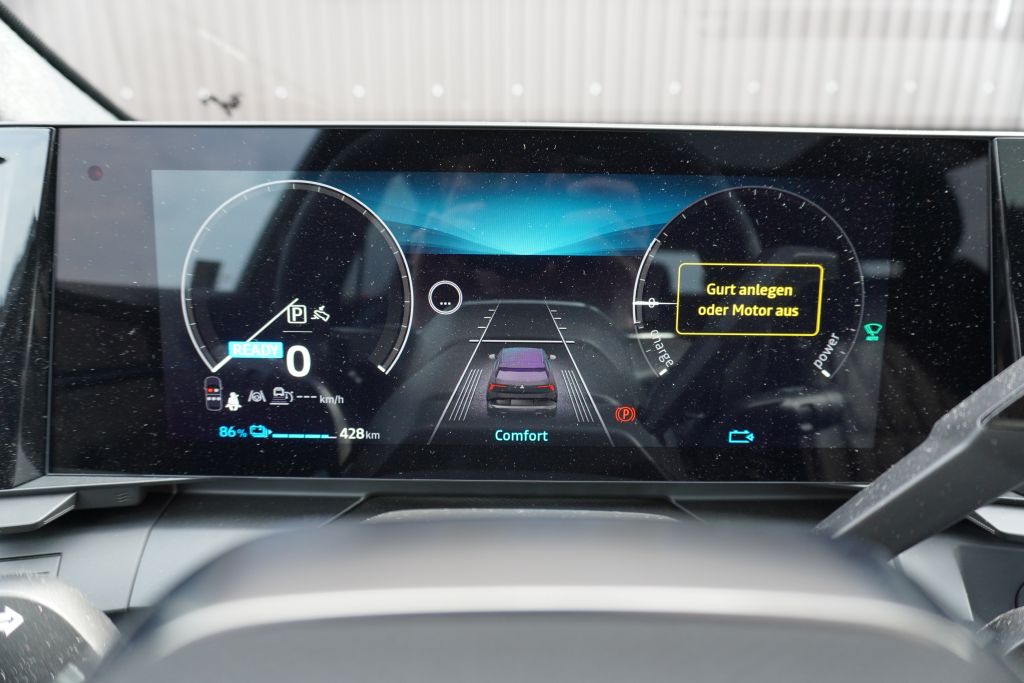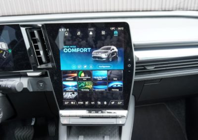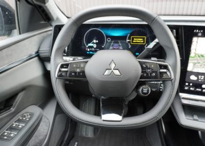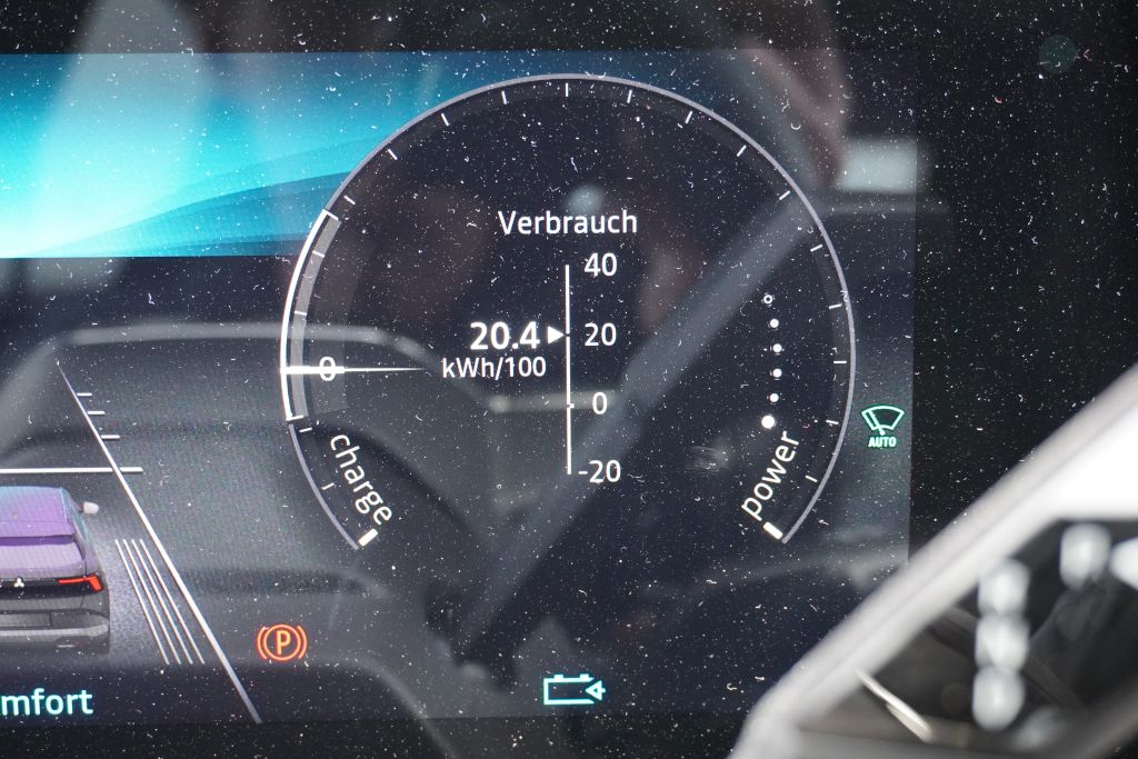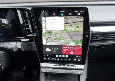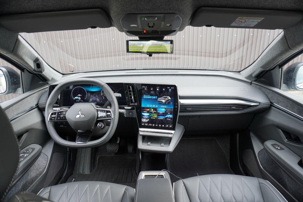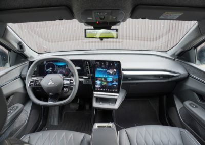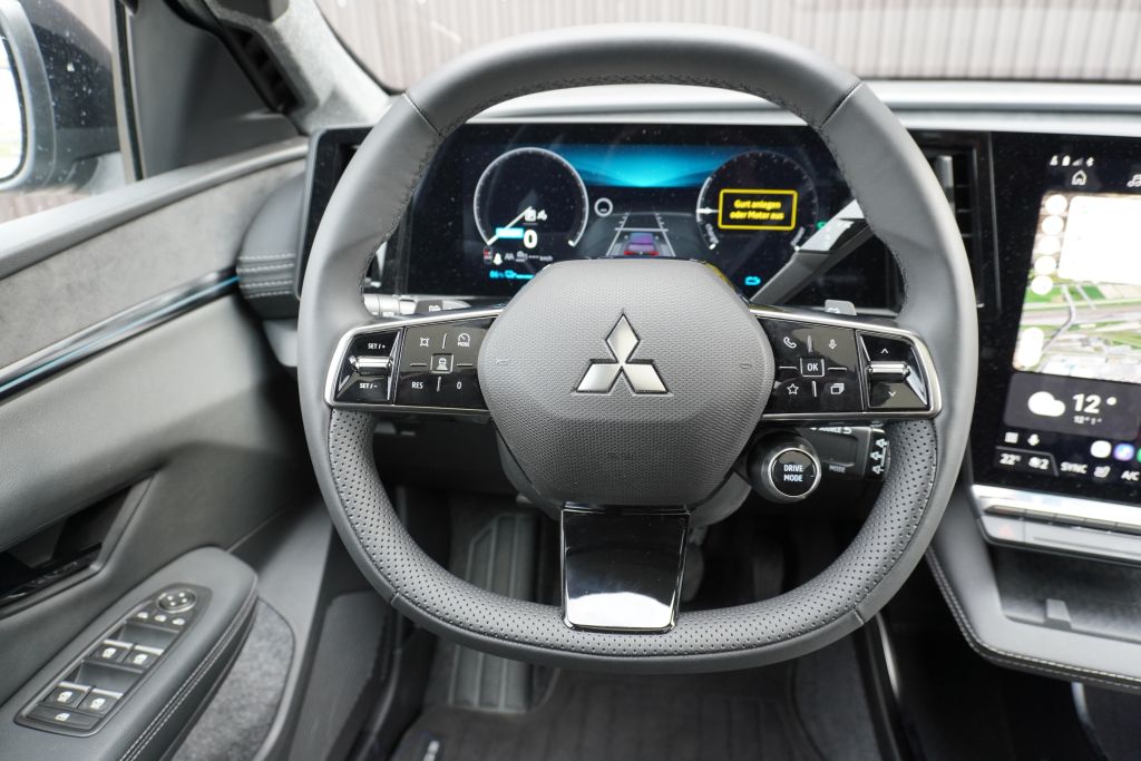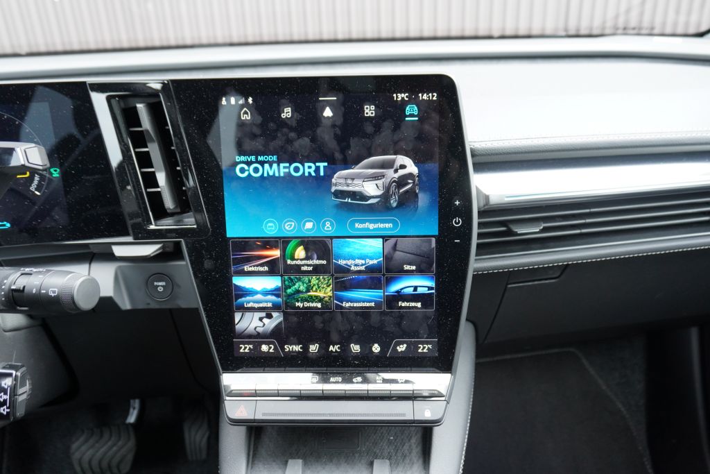 Somit spricht der Mitsubishi mehr Kunden an und die Front hat ein eigenes Gesicht, sodass man nicht gleich die Verwandtschaft mit Renault erkennt. Nun füllen wir erst mal den 87 KWh Akku. An der heimischen Wallbox geht dies in sechs Stunden über die Bühne. Schnellladen geht natürlich auch und dies schafft er in durchschnittlichen 45 Minuten. Hier gibt es Bessere im Umfeld. Setzten wir uns in den Eclipse und hier merkt man dann ganz klar, dass es ein Renault ist. Dies soll überhaupt nicht negativ sein, denn der Hochkanttouchscreen ist in vieler Sicht positiv. Er kann mehrere Anzeigen übereinander anzeigen. z.B. die Navikarte und unten Information zu Auto, Radio etc. Man kann auch die Klimasteuerung anzeigen lassen und was sehr gut ist, man steuert sie auch über echte Tasten. Top! Auch die Lenkradtasten sind gut lesbar und bedienbar. Hinter dem Lenkrad wird es dann aber mühsamer. Zum einem steckt dort der Wählhebel, denn man schnell mit dem Wischerhebel vertauscht. Oder die Bedienung der Radio/Medienwiedergabe versteckt sich als Bedieninsel und muss erst auswendig gelernt werden. Sonst hat man aber zu viert gut Platz und bringt noch gute 545 Liter Gepäck unter.