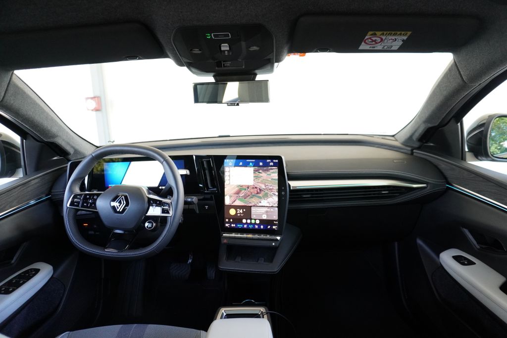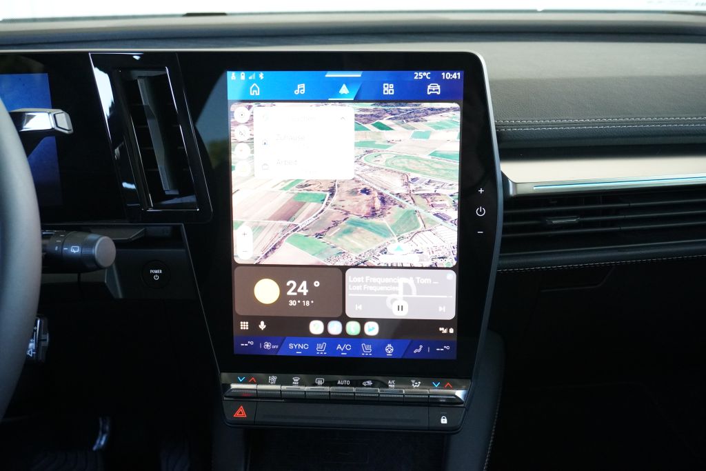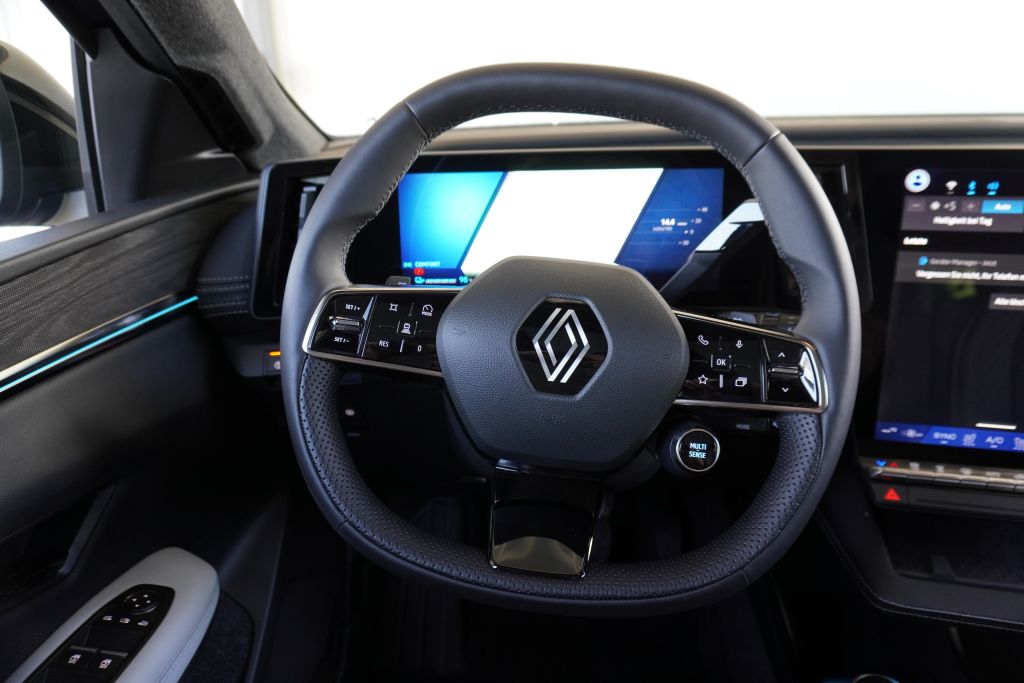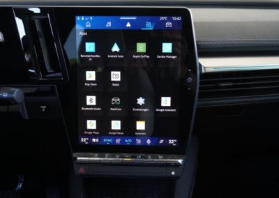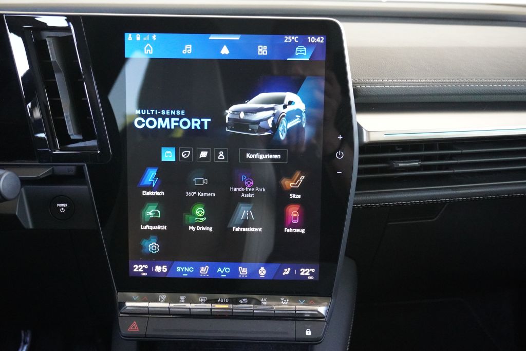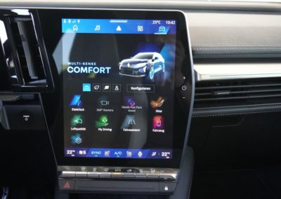 Im Innern sieht es wie im Mégane aus. Einzig was auffällt: Der Wählhebel in der Mittelkonsole ist weg und wanderte hinter das Lenkrad. Die ersten paar Fahrten war es sehr gewöhnungsbedürftig. Etwas Gewöhnung brauchen auch die Tasten auf den Lenkrad, die in Touch gehalten sind und ab und an falsch getroffen werden. Ganz bequem, wie man es von den Franzosen gewohnt ist, sitzt man in der ersten Reihe. Vor dem Lenkrad erstreckt sich ein breites Display. Es lässt sich in verschiedenen Varianten anzeigen. Gleich daneben thront das Infotainment-Display in Hochformat. Es lässt sich recht einfach bedienen und durch sein Format lassen sich viele Informationen von Apple-Car-Play oder Android-Auto darstellen. Leider haben sie bei Renault auch die Klimasteuerung auf den Touchscreen verlegt. Durch den Wählhebel hinter dem Lenkrad gibt es Luft in der Mittelkonsole, so kann man mit der Partnerin um die Beine herum intim werden. Zum Glück ist der Durchgang nicht bis zum Boden, womit die Gefahr nicht besteht Flaschen etc. vom Beifahrer in den Fahrerraum rollt. In der zweiten Reihe sitzen drei Personen gerade noch komod. Zu Zweit ist es viel angenehmer. Man geniesst gute Kopffreiheit, trotz Glasdach. Denn anders als normal ist kein Rollo vorhanden um die Sonne draussen zu halten. Im Scenic können Felder elektrisch angesteuert werden, die dann milchig oder klar sind. Somit kann auf das Rollo verzichtet werden. Im Kofferraum bringt man noch gute 545 Liter unter.